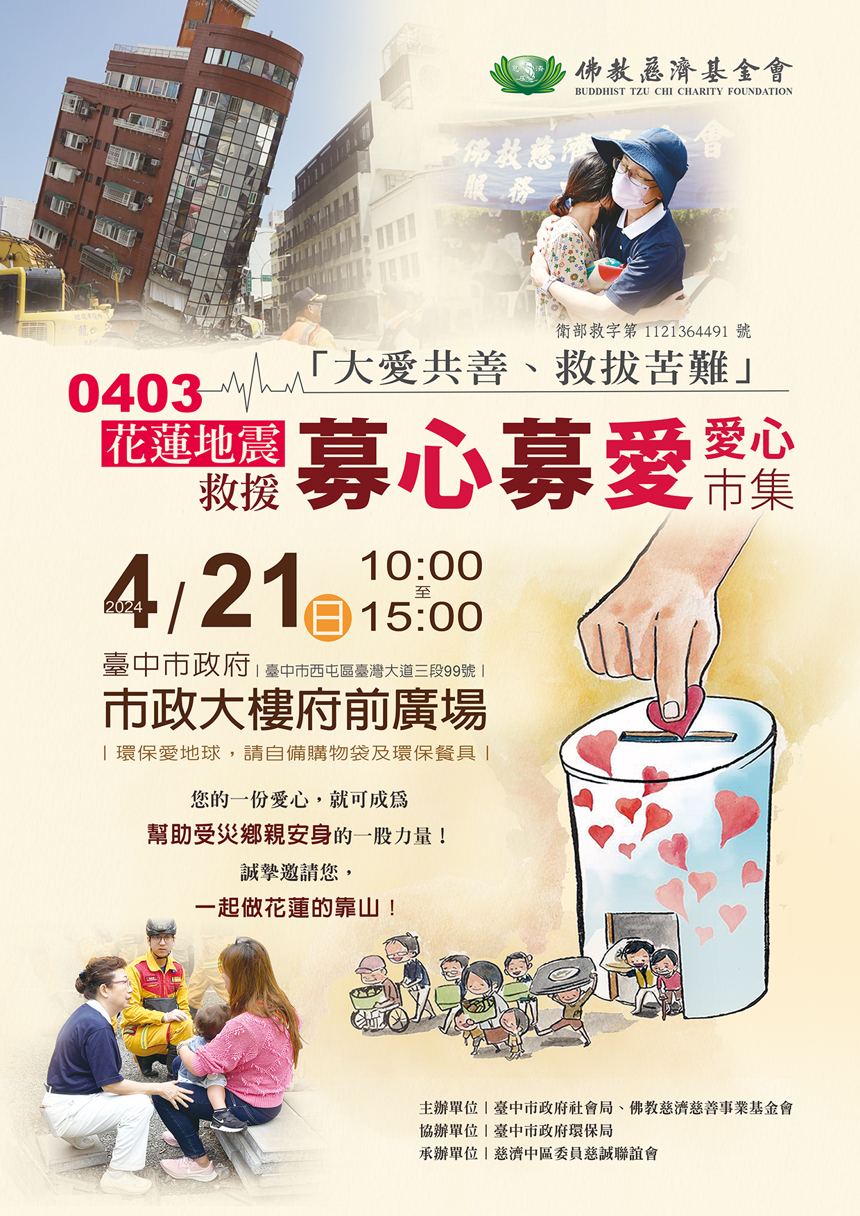 協會響應臺中市政府及慈濟基金會勸募活動,與慈濟基金會一起共善,推動「大愛共善、救拔苦難-0403花蓮地震救援」募心募愛-愛心市集,希望號召更多人響應,將祝福的力量送到苦難的地方,協助災民早日恢復家園,過正常的生活。歡迎大家到現場參與當天的義賣活動。